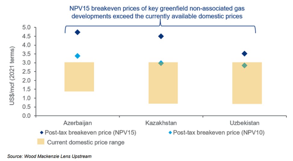 В Азербайджане и Казахстане цены безубыточности газовых «гринфилд» проектов после услаты налогов (NPV15) значительно выше текущих внутренних цен на газ, поэтому эти страны скорее всего будут следовать примеру Узбекистана по либерализации регулируемых цен на газ. Экспертный канал @EnergyNavigator