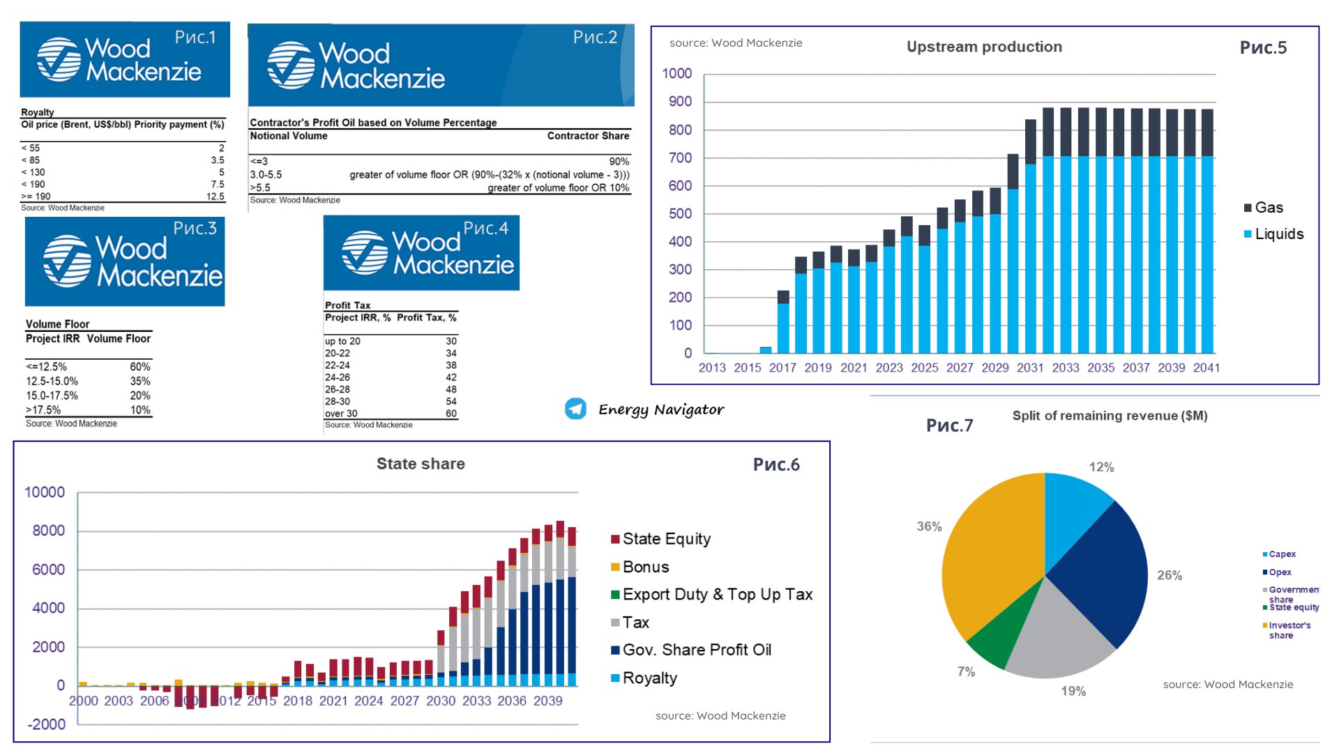 На основе представленных внизу данных WoodMackenzie (доступные на сайте WoodMac, если есть подписка) проанализирована экономическая модель крупного проекта Кашаган. Анализ может не отражать абсолютно все контрактные нюансы но, довольно близок к реальности, что позволяет оценить текущее положение дел довольно точно.