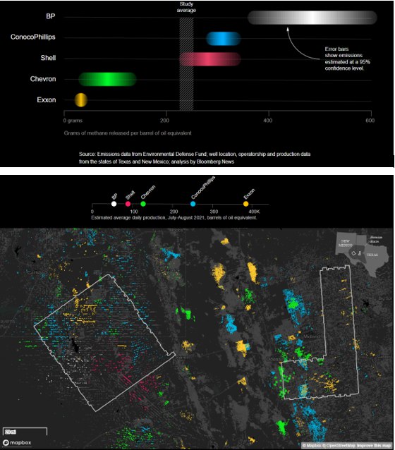Анализ исходных данных Bloomberg, собранных в Пермском бассейне, крупнейшем нефтяном месторождении США, показывает, что нефтегазовые операции BP являются одними из самых грязных среди крупных работающих там компаний. Тот же анализ показывает, что ExxonMobil является одной из самых чистых.