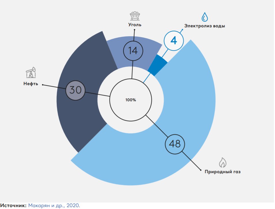 В структуре производства водорода в мире сегодня глобально доминирует органическое топливо (природный газ, уголь и нефть) — ~96%, и только ~4% водорода производится методом электролиза воды, что в настоящий момент не позволяет отнести водородную энергетику к возобновляемой и экологически чистой.