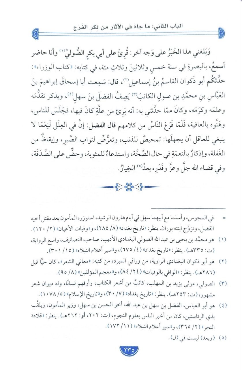 يروي القاضي التنوخي أنَّ الفضلَ بنَ سهل بَرِئَ من علَّةٍ أصابته، فجلس للناس يُهنِّئونه بالعافية، فلمَّا فرغوا من كلامهم قال: