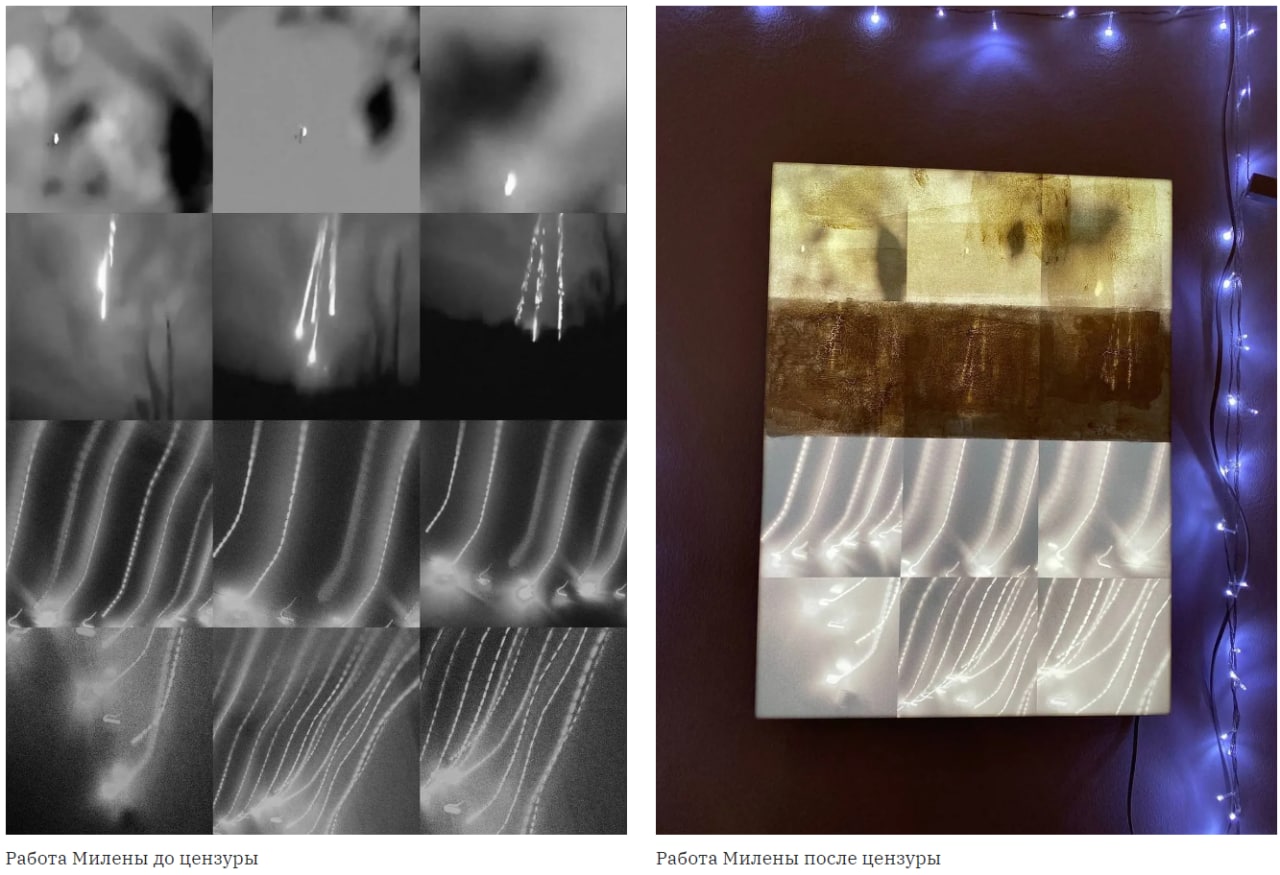 «Мою работу мы с кураторами решили [частично] замазать, чтобы можно было ее выставить хоть как-то. Мне написала куратор выставки, что работу не пропускают. Поэтому либо ее не будут выставлять, либо нужно что-то переделать. Были претензии, что это похоже на взрывы».