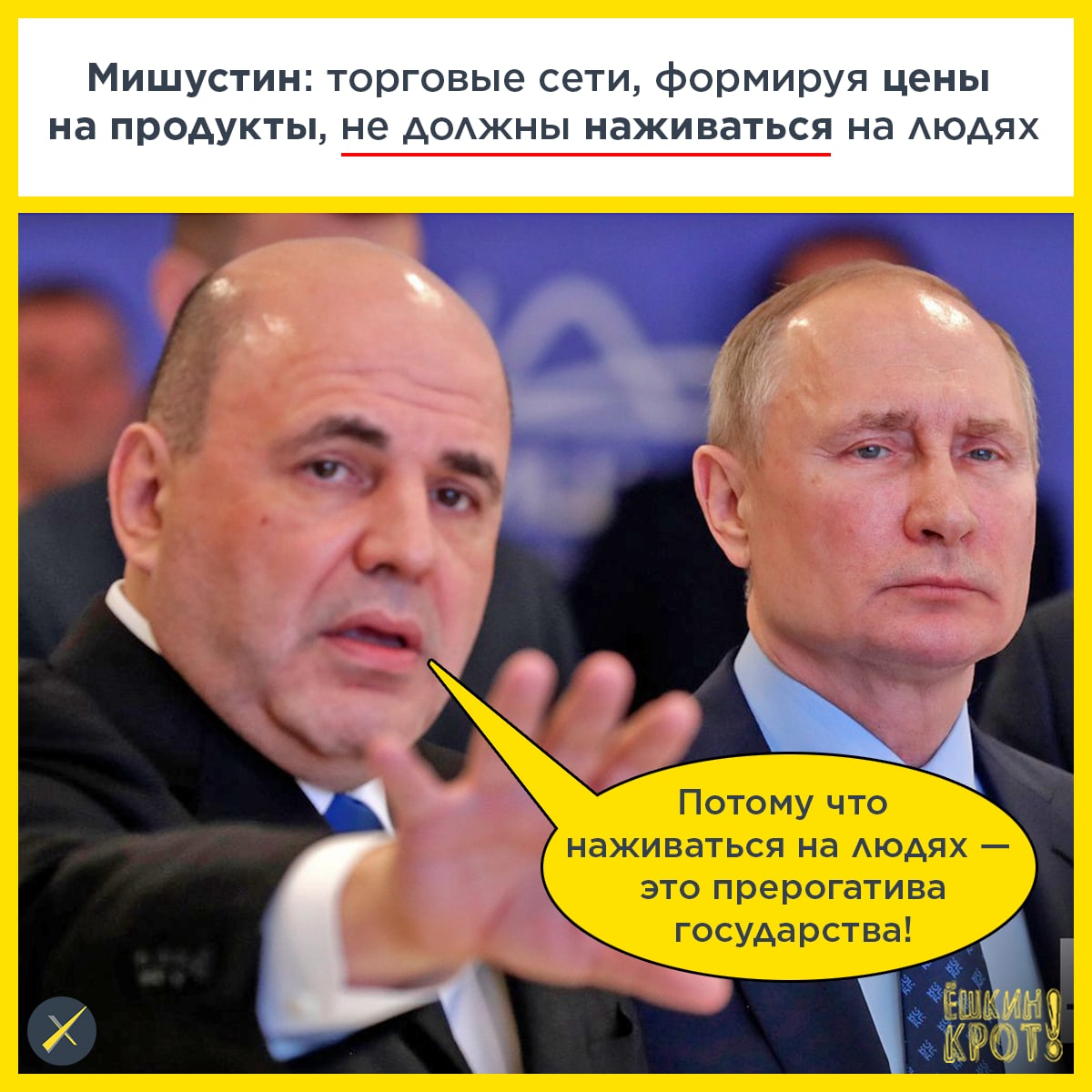 Вслед за начальником, хмурить брови и демонстративно грозить пальчиком из-за резкого повышения цен на продукты начали Мишустин и Песков.