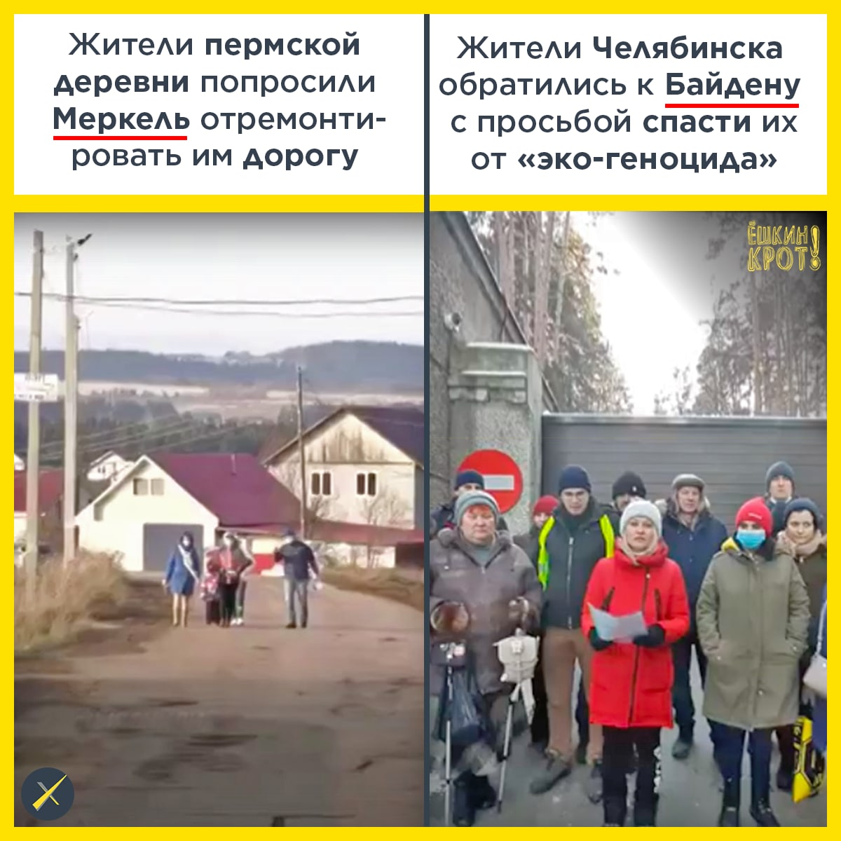 Ранее жители пермской деревни Косотуриха записали обращение к канцлеру Германии Ангеле Меркель с просьбой отремонтировать им дорогу, по которой сейчас с трудом проезжают машины скорой помощи, пожарные службы и школьные автобусы. Жители Косотурихи написали письмо в посольство Германии, предложив присоединить проблемный участок к немецкой дорожной системе и построить там качественную магистраль, так как от местных властей они получали лишь «одни отписки и одни отказы»