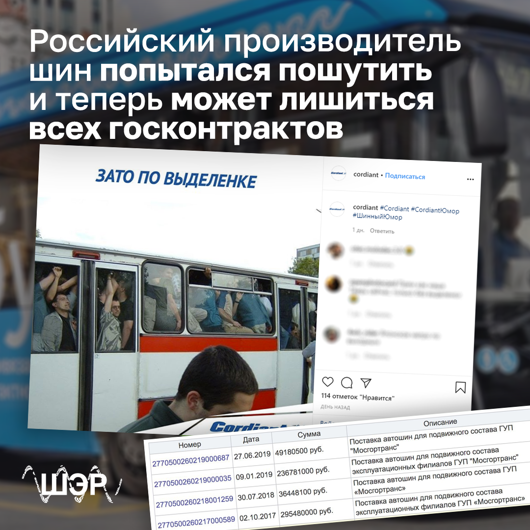Потрясающая ситуация еще и по той причине, что Cordiant производит шины не только для личного транспорта, но и для автобусов. Более того, ответственная редакция нашего канала обнаружила у Cordiant жирные госконтракты с Департаментом транспорта Москвы на поставку шин для автобусов.