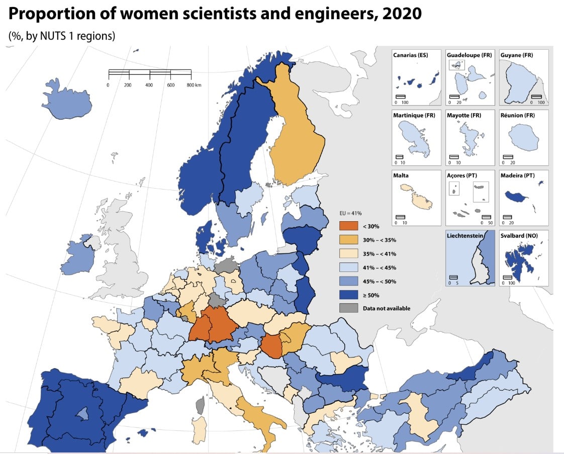 Среди государств-членов ЕС доля женщин-ученых и инженеров в 2020 году сильно различалась: от 52% в Литве, Португалии и Дании до 30% в Финляндии и 31% в Венгрии.
