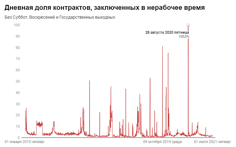 На графике в этом посте (интерактивная его версия доступна в блоге на Хабр) мы видим дневную долю контрактов, заключенных в нерабочее время с 2015 по 2021 год (без учета суббот, воскресений и государственных выходных). Вы могли заметить череду нелогичных пиков, которые, на первый взгляд, не подчиняются какой-либо системе. Самый большой из них – 100% всех контрактов за день были выполнены в неурочное время – произошел 28 августа 2020 года (в пятницу), а следующий по величине – 81.41% – 9 октября 2019 года (в среду).