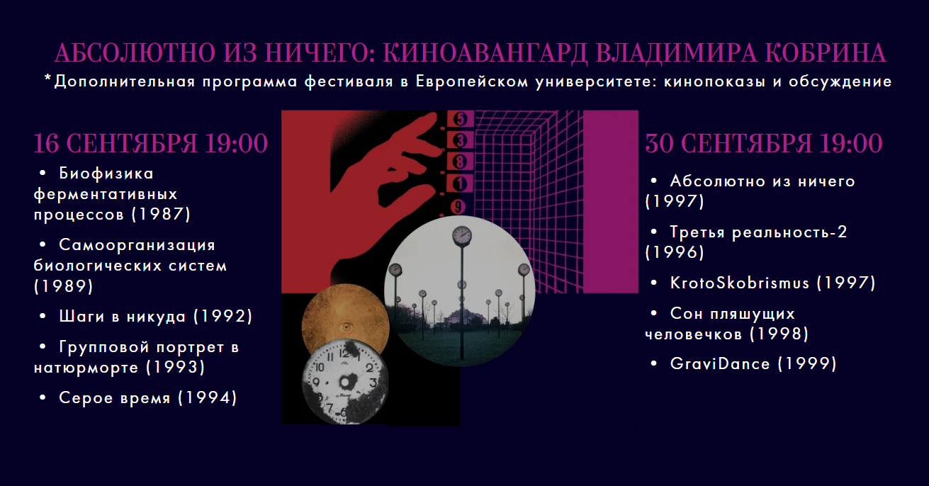 16 и 30 сентября в Европейском университете состоятся кинопоказы и обсуждение фильмов Владимира Кобрина в рамках дополнительной программы фестиваля «Мир знаний» и выставки «Абсолютно из ничего: киноавангард Владимира Кобрина» в Ленфильме.