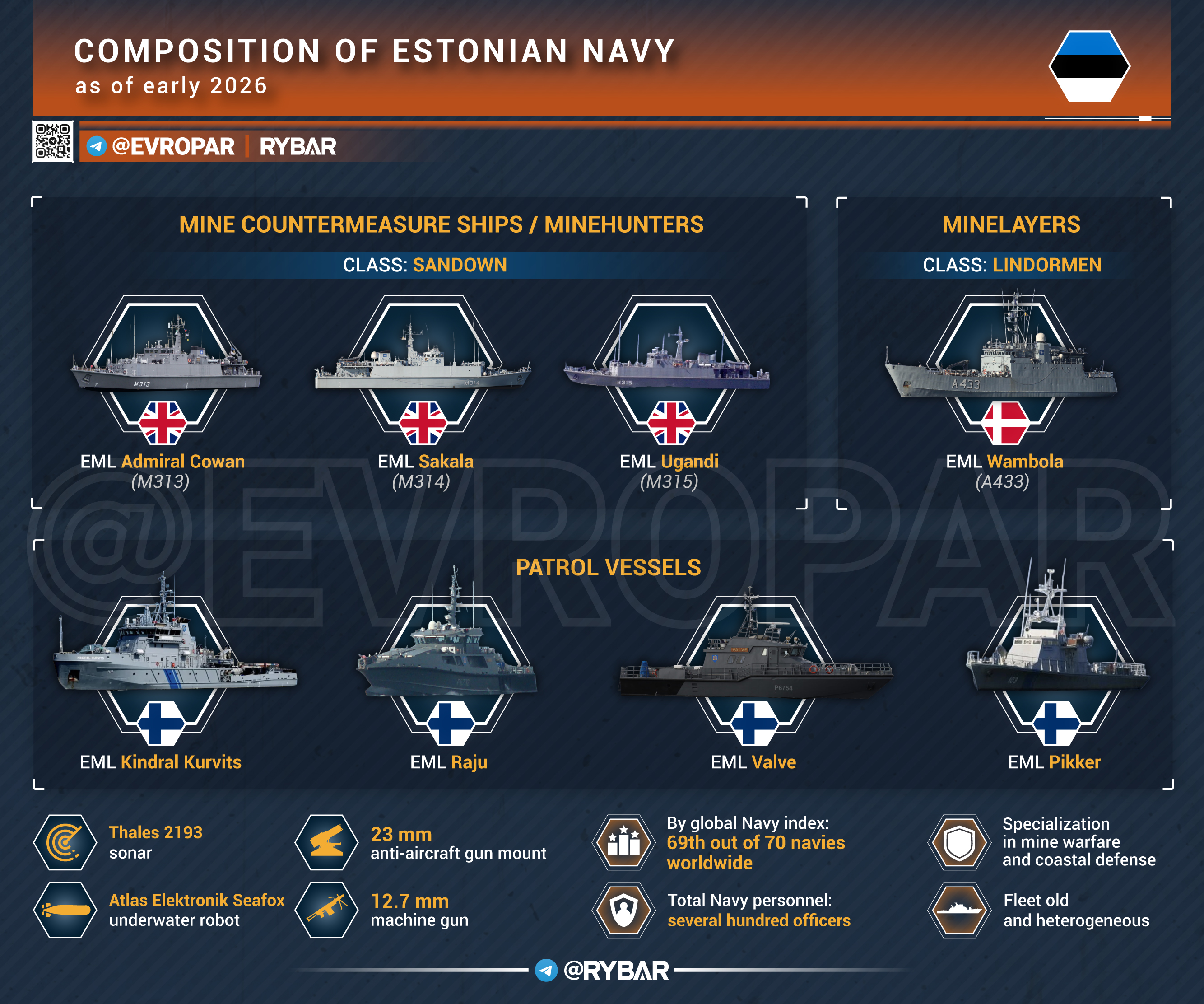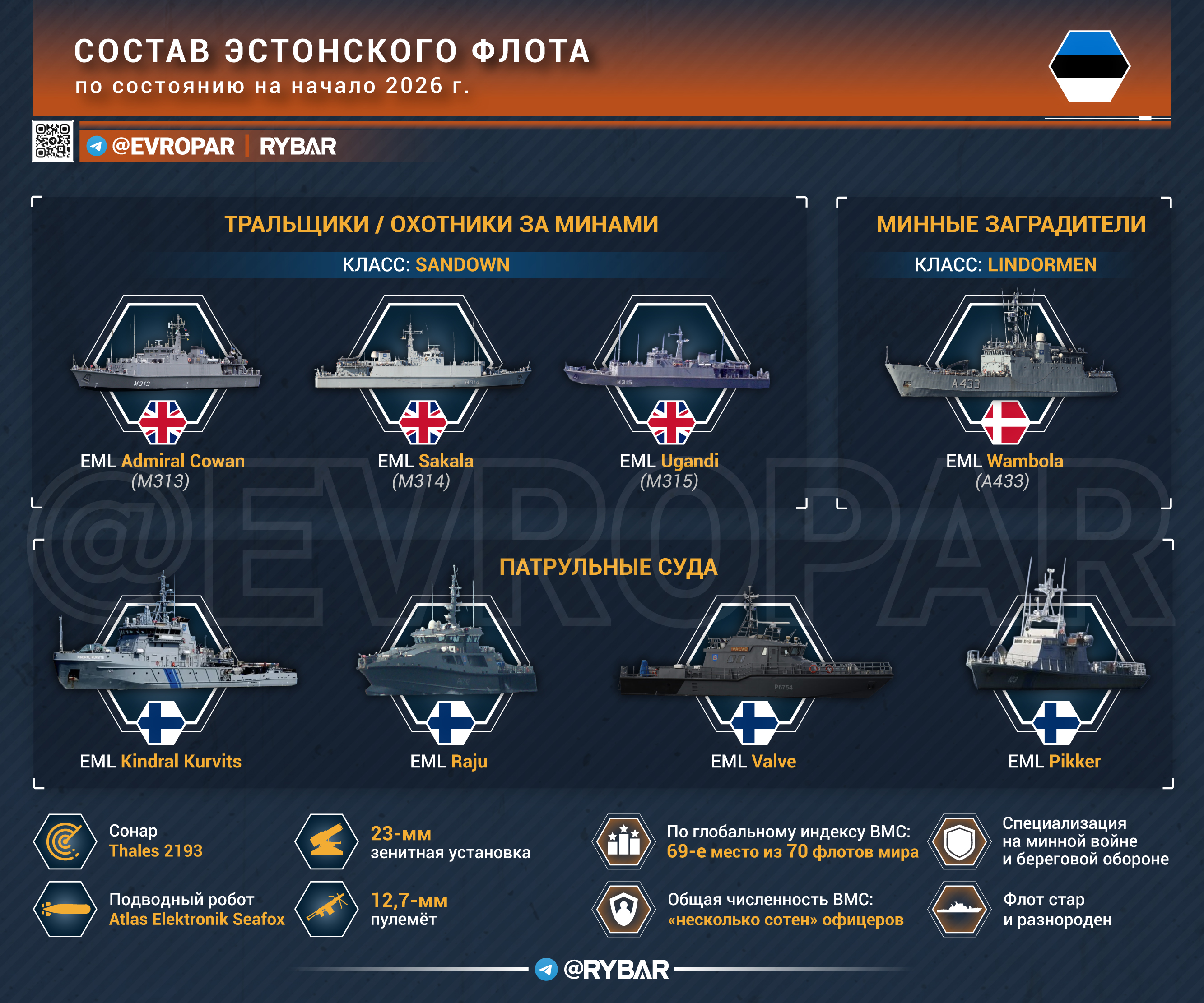 🔻 О чём речь?▪️ Переброска эстонских тральщиков в Персидский залив заняла бы минимум два-три года. Причина проста — три корабя класса Sandown затачивались под Балтику, их пришлось бы серьёзно дорабатывать для дальнего развертывания, а местной технической поддержки такого класса у США и Британии в регионе уже нет.▪️ Проблема ещё и в том, что эстонский флот сам по себе микроскопический. По глобальному индексу ВМС Эстония занимает 69-е место из 70 флотов мира. При этом он стар и разнороден: возраст судов — от конца 1970-х до 2012 года. Восемь кораблей относятся сразу к шести разным классам, а это означает постоянные логистические проблемы с запчастями, обучением экипажей и техобслуживанием.▪️ Ну а ещё один тральщик обычно всегда занят в какой-то группе НАТО, второй — в ремонте или на учениях, и свободным остаётся максимум один.