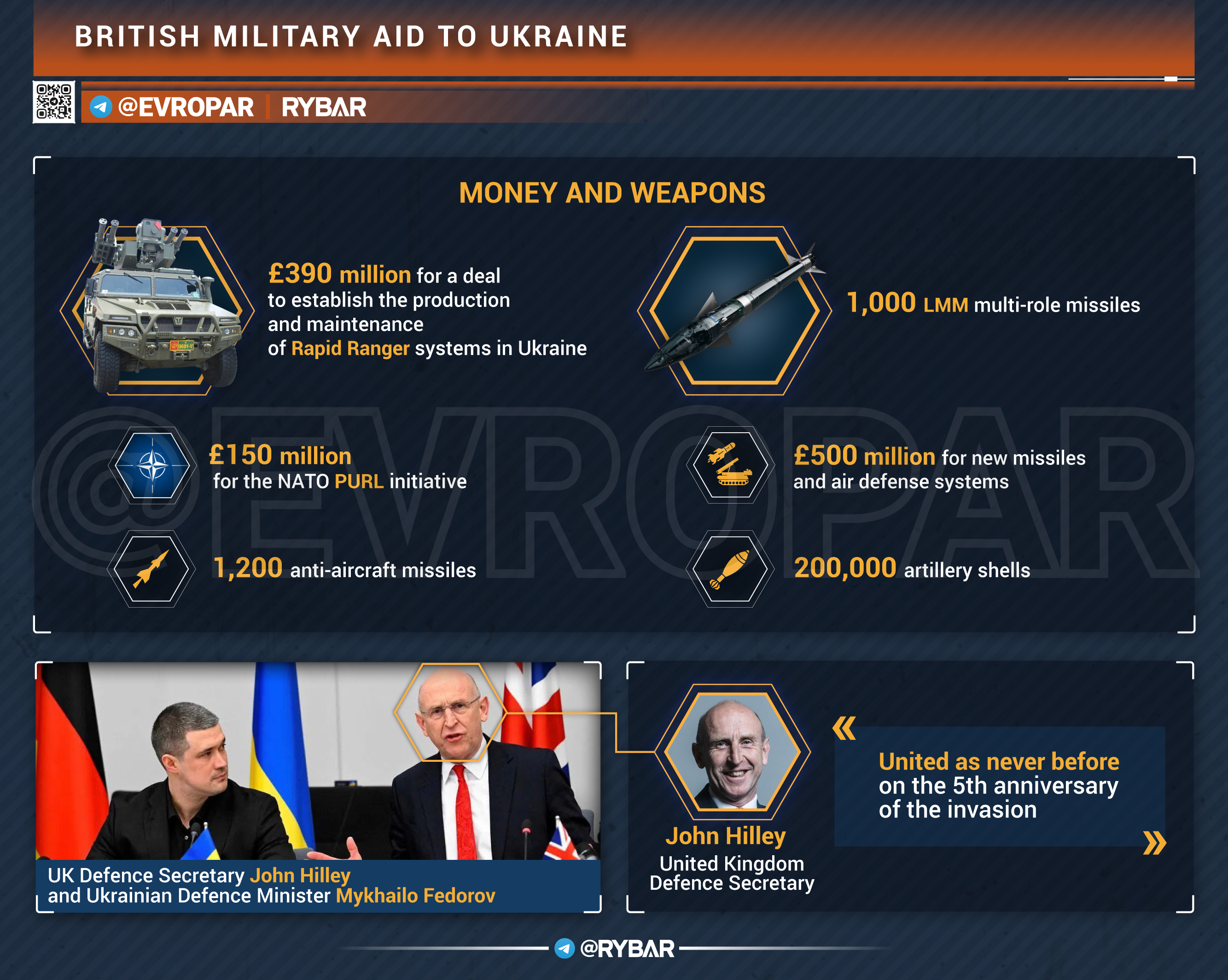 В пакет помощи входят 1000 многоцелевых ракет LMM и £390 млн на сделку по организации производства и обслуживания пусковых установок Rapid Ranger на украинской территории. Кроме того, Британия поставит ещё 1200 зенитных ракет и 200 тысяч артиллерийских снарядов.