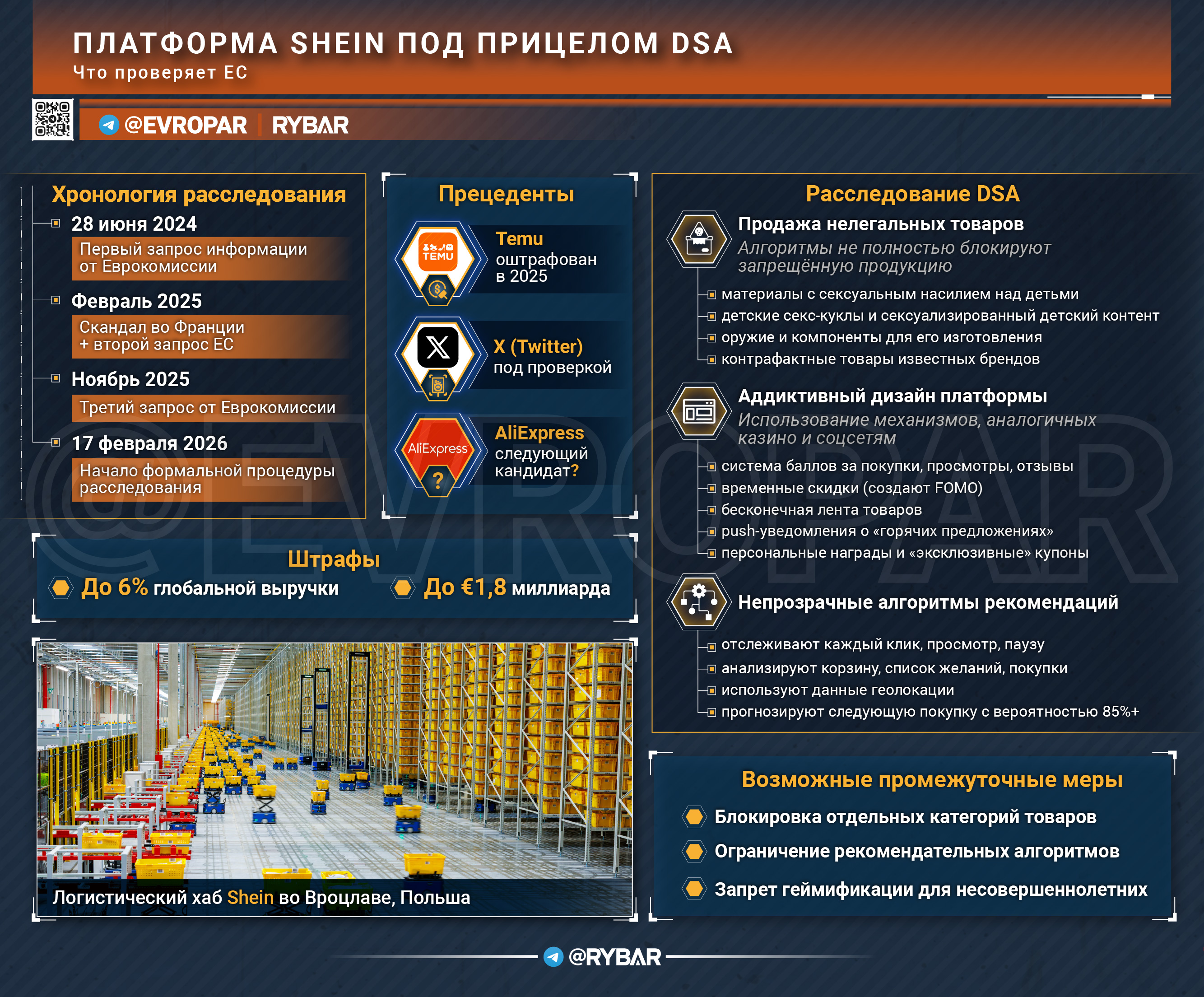 Еврокомиссия открыла формальную процедуру расследования против платформы Shein в рамках Регламента о цифровых услугах (DSA). Это первый подобный шаг против китайского гиганта «быстрой моды», который с 2023 года классифицируется как «очень крупная онлайн-платформа» (Very Large Online Platform, VLOP) и находится под усиленным надзором ЕС.