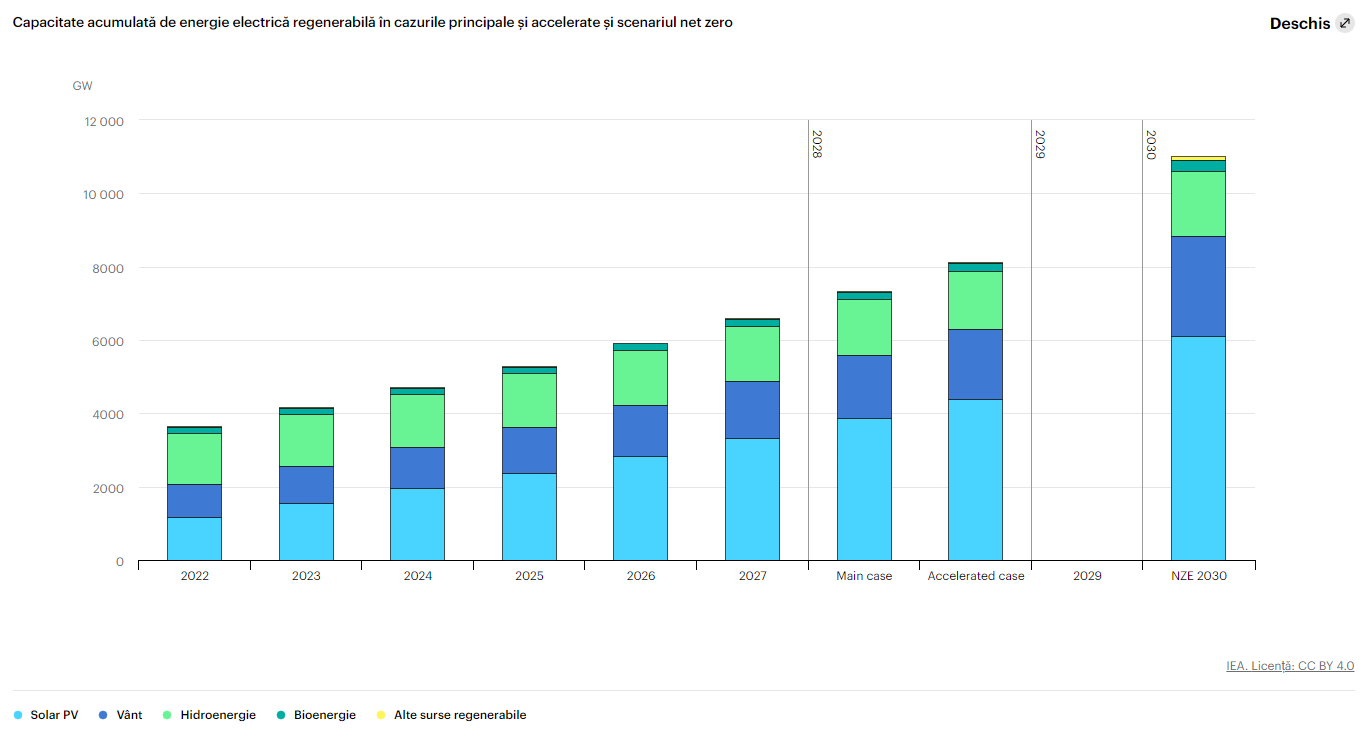 ⚡️ În condițiile politicilor existente și a condițiilor de piață, se estimează că capacitatea globală de energie regenerabilă va ajunge la 7 300 GW până în 2028. Această traiectorie de creștere ar duce la creșterea capacității globale de 2,5 ori nivelul actual până în 2030, dar fără a atinge obiectivul de triplare.
