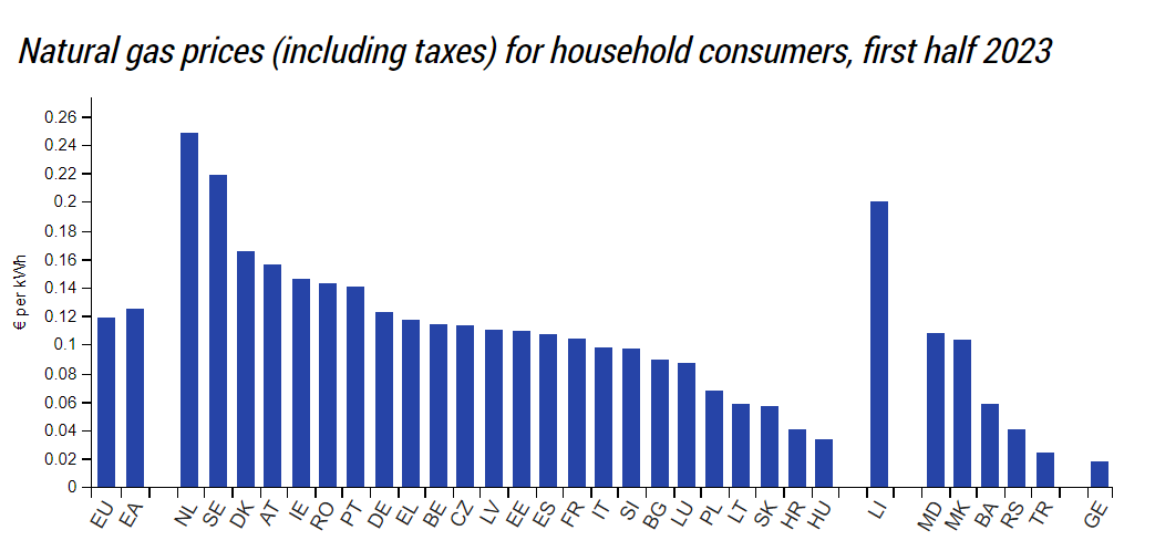 🔥 Potritiv datelor oficiale ale Eurostat (Oficiul pentru Statistică al Uniunii Europene), în primul semestru al anului 2023, prețul mediu pentru gaze în UE a fost de 0,1187 eurocenți pentru 1 Kwt/h (kilowatt-oră). În Republica Moldova, în aceeaşi perioadă, preţul a fost de 0,1082 eurocenți pentru 1 Kwt/h.