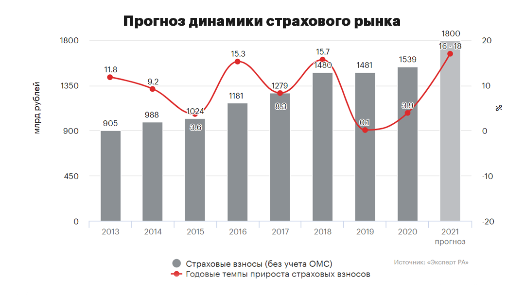 По итогам 2021 года страховой рынок соберет на 16–18 % премии больше, чем за 2020-й, и достигнет отметки 1,8 трлн рублей. Объем взносов по страхованию жизни, в котором наблюдается очередной подъем за счет возобновления роста ИСЖ, опережающей динамики кредитного страхования и продвижения программ НСЖ, составит 530 млрд рублей (+22–24 %). Страхование от несчастных случаев и болезней (+38–40 %) продолжит расти под влиянием высоких темпов розничного, в т. ч. ипотечного кредитования. ДМС вернется к положительной динамике (+11–12 %) в результате оживления спроса со стороны физических лиц и небольших предприятий, а также наполнения полисов рисками, связанными с коронавирусом. Динамика страхования прочего имущества граждан (+15–16 %) продолжит находиться под влиянием тенденции восстановления покупательской активности в результате реализации отложенного спроса, поддержку также окажет растущий ипотечный рынок. ОСАГО (+4–5 %) прибавит за счет увеличения числа заключаемых договоров, страхование автокаско (+16–17 %) – по причине роста стоимости и сохранения высокого спроса на автомобили. Факторы активного роста страхования имущества юридических лиц пока отсутствуют, сегмент прибавит 1–2 % премии.