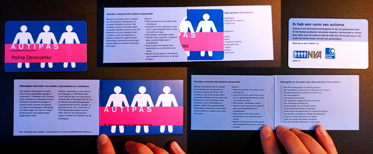 По её наводке я зарегистрировалась в Аутической ассоциации Нидерландов (Nederlandse Vereniging voor Autisme) и заказала для себя Аутипас — карточку, при помощи которой можно быстро дать окружающим понять, что у тебя, твоего ребёнка или партнёра аутизм, чтобы они поняли, например, что происходит, если ты сидишь на земле, раскачиваешься взад-вперёд, рыдаешь в голос и не можешь словами пояснить ситуацию.
