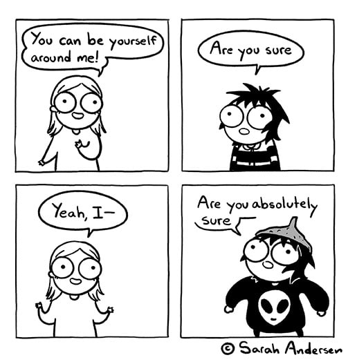[Картинка — это комикс из серии Sarah's Scribbles о 4 кадрах. На первом кадре человек говорит: «Со мной ты можешь быть собой». На втором кадре главная героиня комикса ему/ей отвечает: «Ты уверен/а?». На третьем кадре первый/ая человек начинает отвечать: «Да, я...». На четвёртом кадре главная героиня появляется в кофте с изображением инопланетянина и с воронкой на голове и вопрошает снова: «Ты точно уверен/а?».]