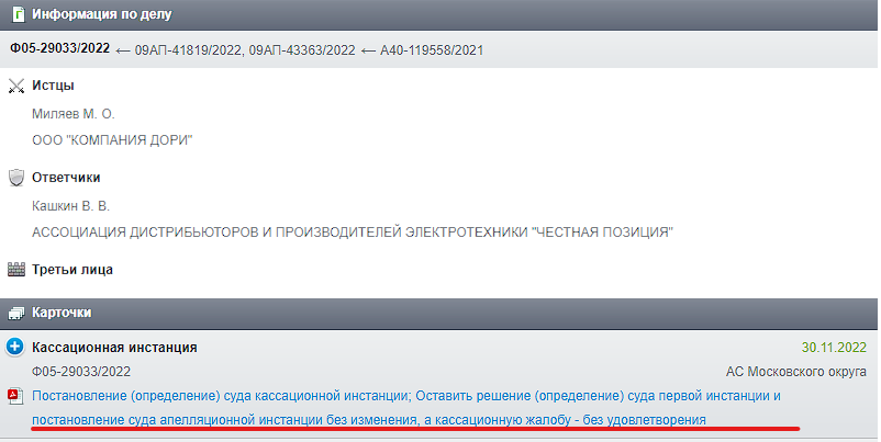 👨⚖️Суды первой и апелляционной инстанции отказывали в иске ООО «Компания Дори» и Михаилу Миляеву к Ассоциации «Честная позиция» и ее генеральному директору Владимиру Кашкину.