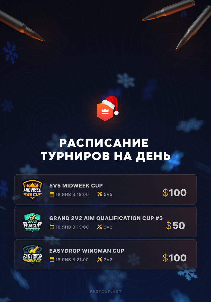 15:00 | $10 | EasyDrop Winter Aim Cup - https://csgo.fastcup.net/tournaments/1543