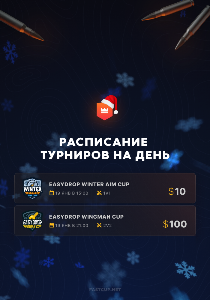 15:00 | $10 | EasyDrop Winter Aim Cup - https://csgo.fastcup.net/tournaments/1543