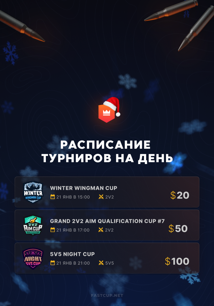 15:00 | $20 | Winter Wingman Cup - https://csgo.fastcup.net/tournaments/1580