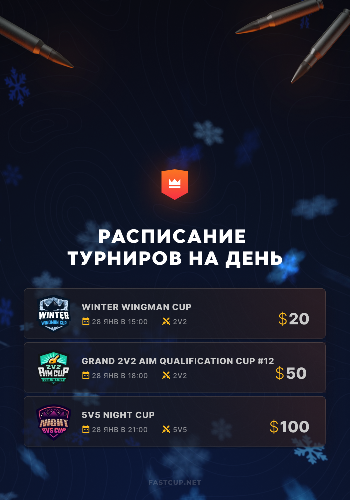 15:00 | $20 | Winter Wingman Cup - https://csgo.fastcup.net/tournaments/1581