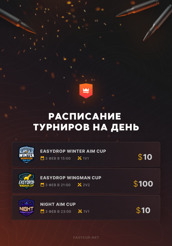 21:00 | $100 | EasyDrop Wingman Cup - https://csgo.fastcup.net/tournaments/1694