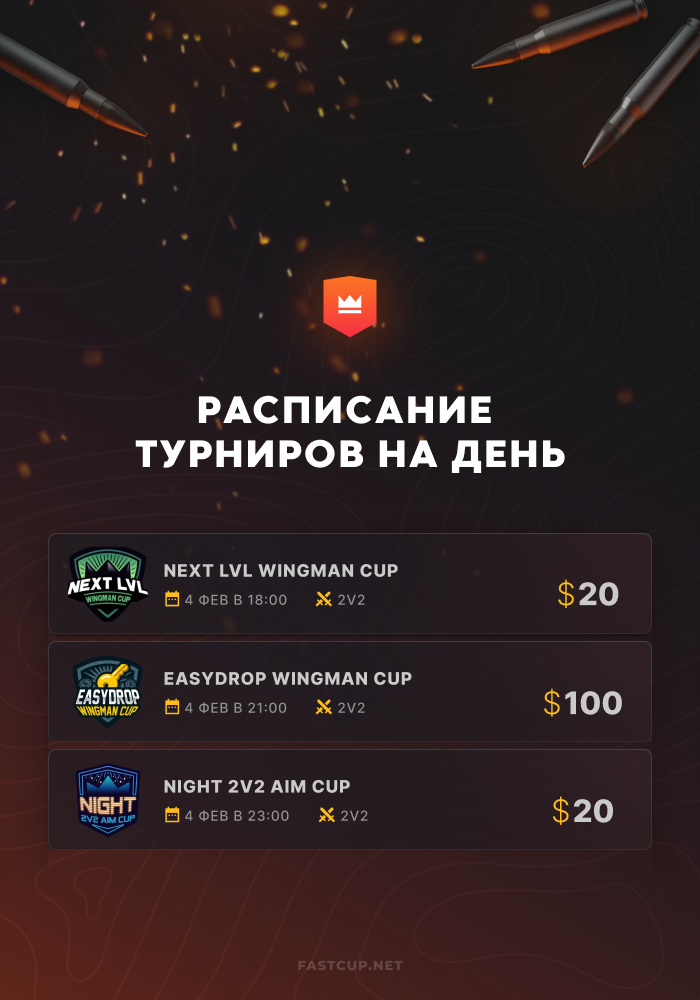 21:00 | $100 | EasyDrop Wingman Cup - https://csgo.fastcup.net/tournaments/1694