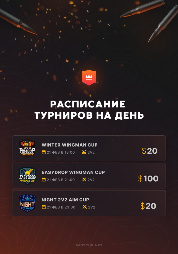 21:00 | $100 | EasyDrop Wingman Cup - https://csgo.fastcup.net/tournaments/1713