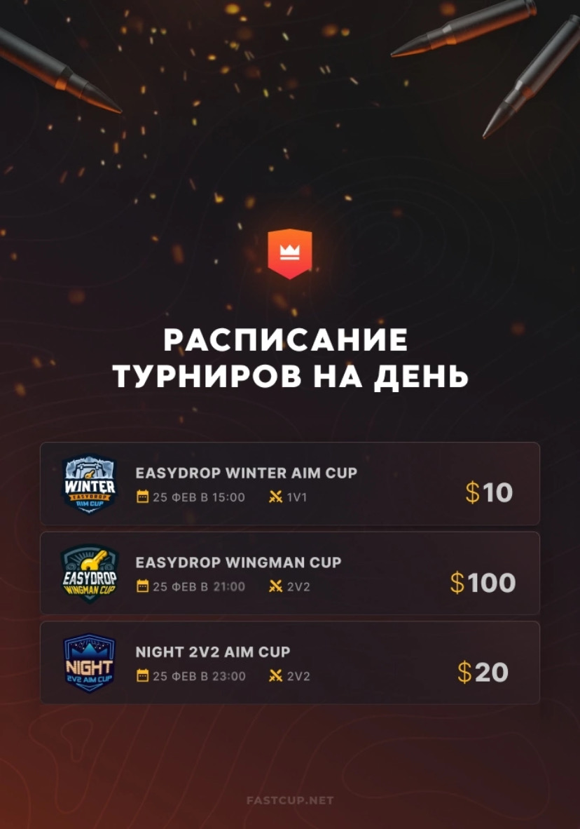 21:00 | $100 | EasyDrop Wingman Cup - https://csgo.fastcup.net/tournaments/1715