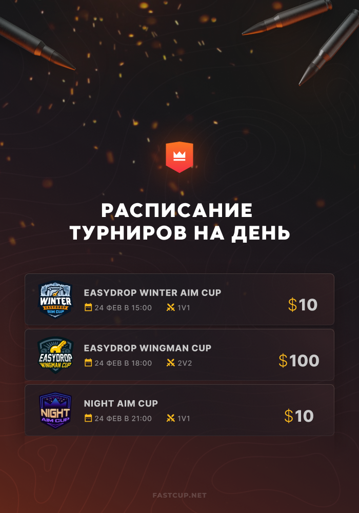 15:00 | $10 | EasyDrop Winter Aim Cup - https://csgo.fastcup.net/tournaments/1763