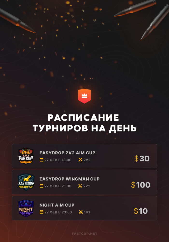 23:00 | $10 | Night AIM Cup - https://csgo.fastcup.net/tournaments/1892