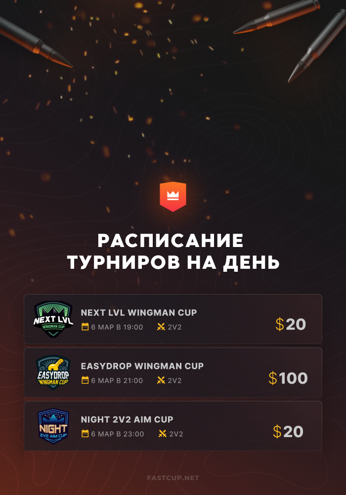 21:00 | $100 | EasyDrop Wingman Cup - https://csgo.fastcup.net/tournaments/1987