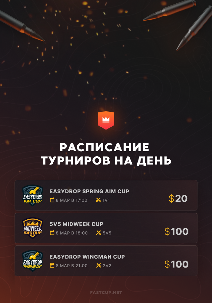 17:00 | $20 | EasyDrop Spring Aim Cup - https://csgo.fastcup.net/tournaments/1958