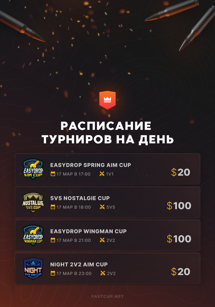 17:00 | $20 | EasyDrop Spring Aim Cup - https://csgo.fastcup.net/tournaments/1965