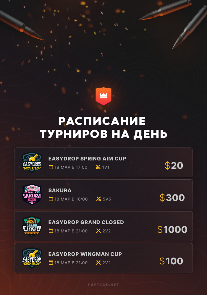 17:00 | $20 | EasyDrop Spring Aim Cup - https://csgo.fastcup.net/tournaments/1966