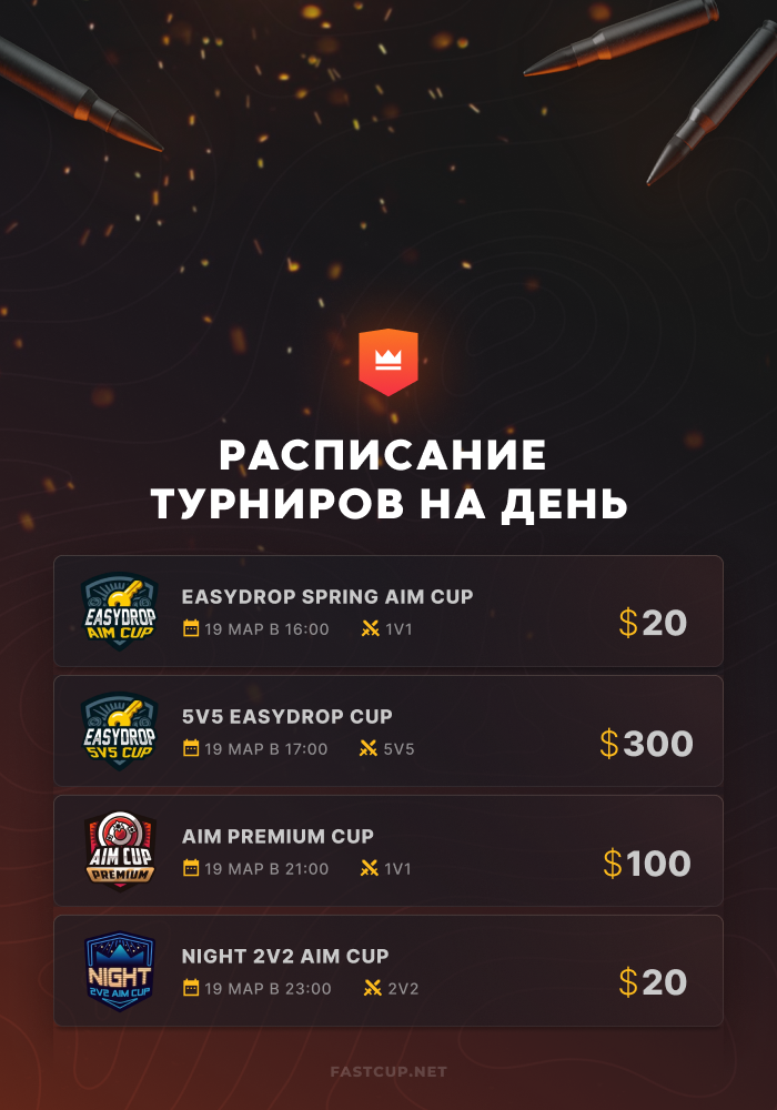 17:00 | $20 | EasyDrop Spring Aim Cup - https://csgo.fastcup.net/tournaments/1968