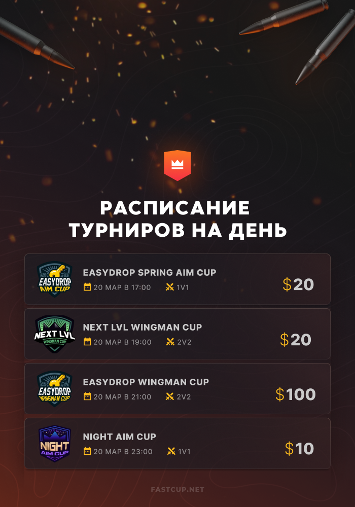 17:00 | $20 | EasyDrop Spring Aim Cup - https://csgo.fastcup.net/tournaments/1968