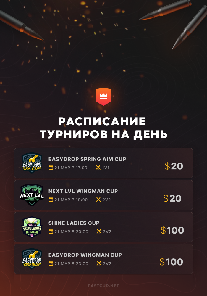 17:00 | $20 | EasyDrop Spring Aim Cup - https://csgo.fastcup.net/tournaments/1971