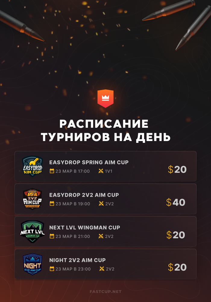 17:00 | $20 | EasyDrop Spring Aim Cup - https://csgo.fastcup.net/tournaments/1974