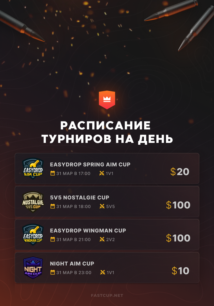 17:00 | $20 | EasyDrop Spring Aim Cup - https://csgo.fastcup.net/tournaments/2230