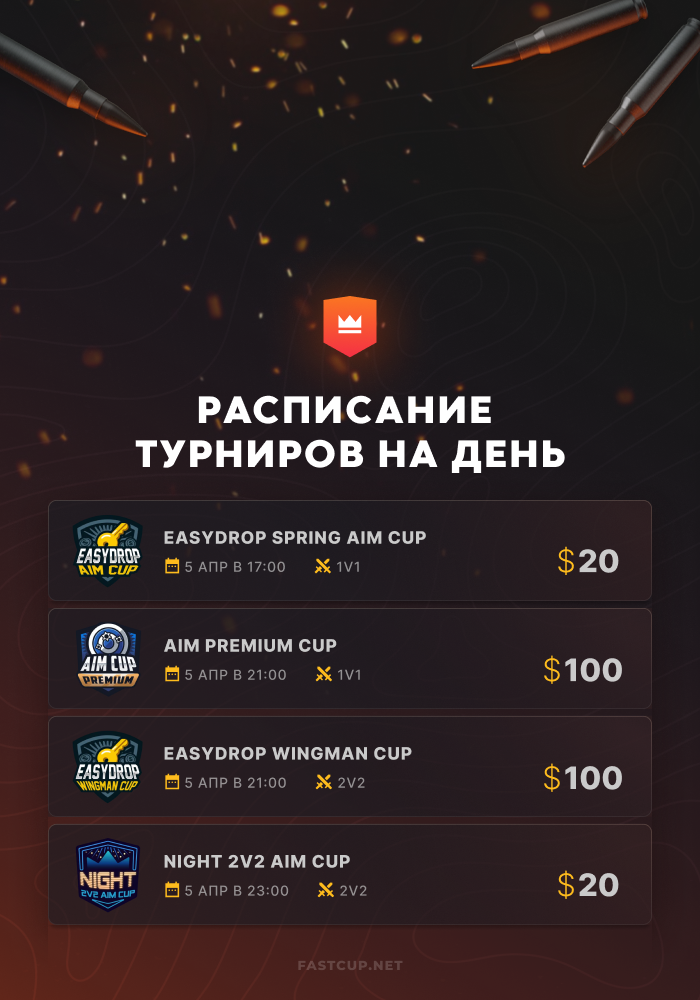 17:00 | $20 | EasyDrop Spring Aim Cup - https://csgo.fastcup.net/tournaments/2234