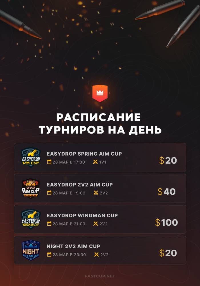 17:00 | $20 | EasyDrop Spring Aim Cup - https://csgo.fastcup.net/tournaments/1979