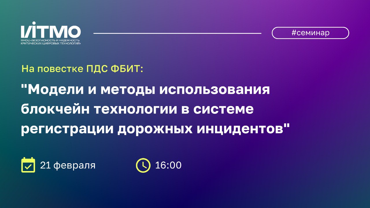 21 февраля пройдет постоянно-действующий семинар ФБИТ. Аспирант Давыдов Вадим Валерьевич расскажет, как решить проблему безопасности в докладе “Модели и методы использования блокчейн технологии в системе регистрации дорожных инцидентов”.
