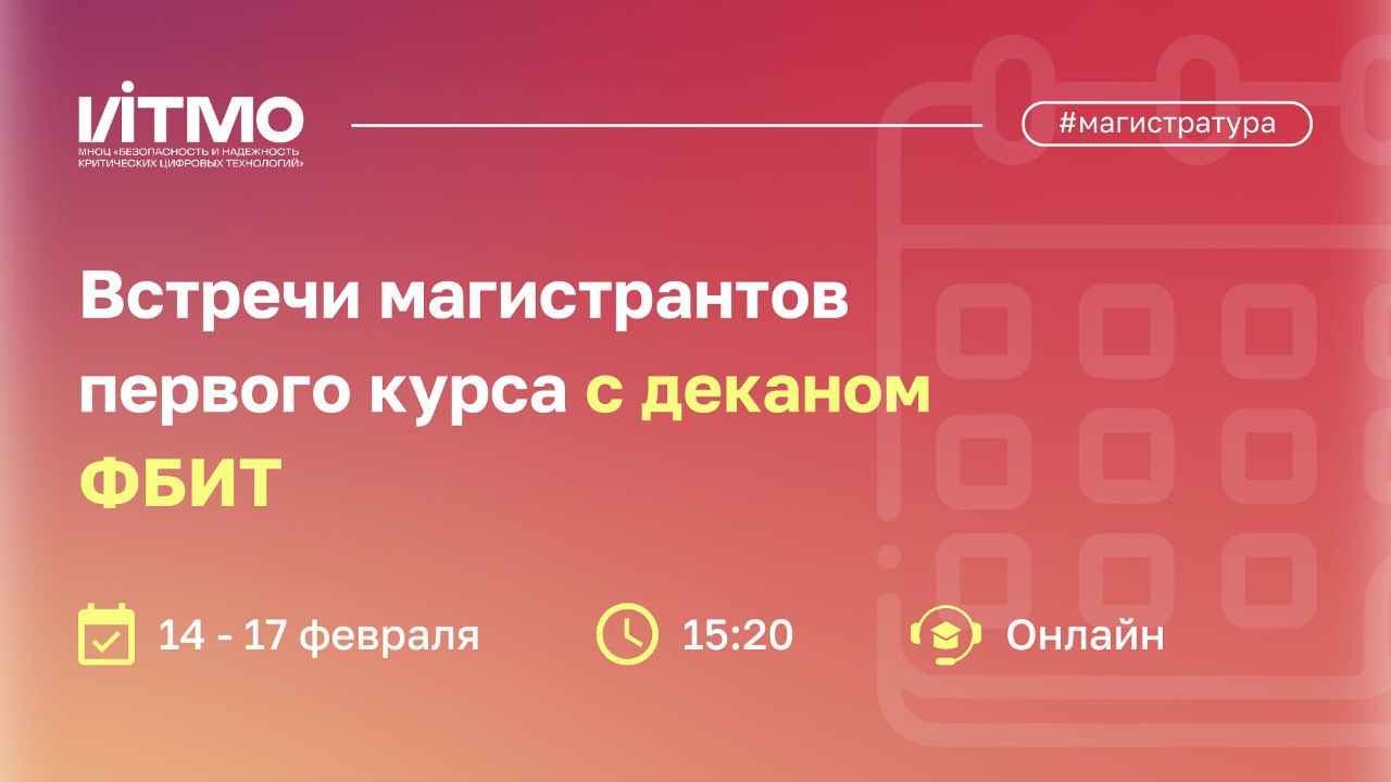 Одна из главных задач в магистратуре — это своевременно выбрать научного руководителя и тему исследования. Чтобы помочь первокурсникам с выбором, декан ФБИТ Заколдаев Данил Анатольевич проведет дистанционные встречи. На встречах вы обсудите работу над ВКР, результаты зимней сессии и сможете задать вопросы.