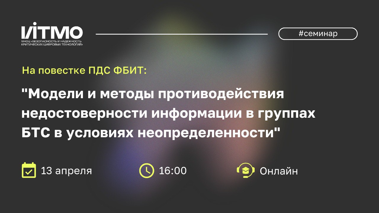 13 апреля пройдет постоянно-действующий семинар ФБИТ. Магистрант Ляховенко Юлия Александровна расскажет о “Моделях и методах противодействия недостоверности информации в группах беспилотных транспортных средств в условиях неопределенности”.