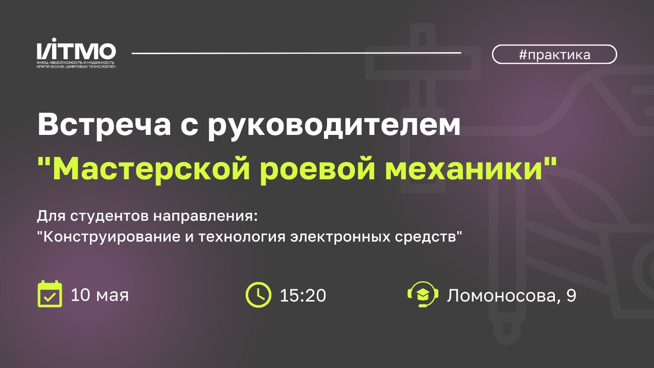 ФБИТ приглашает студентов бакалавриата 2-3 курса и первокурсников магистратуры направления «Конструирование и технология электронных средств» (11.03.03 и 11.04.03) на встречу с руководителем «Мастерской роевой механики» Ткаченко Дмитрием Викторовичем. Вы узнаете о возможностях для студентов-конструкторов в Мастерской: