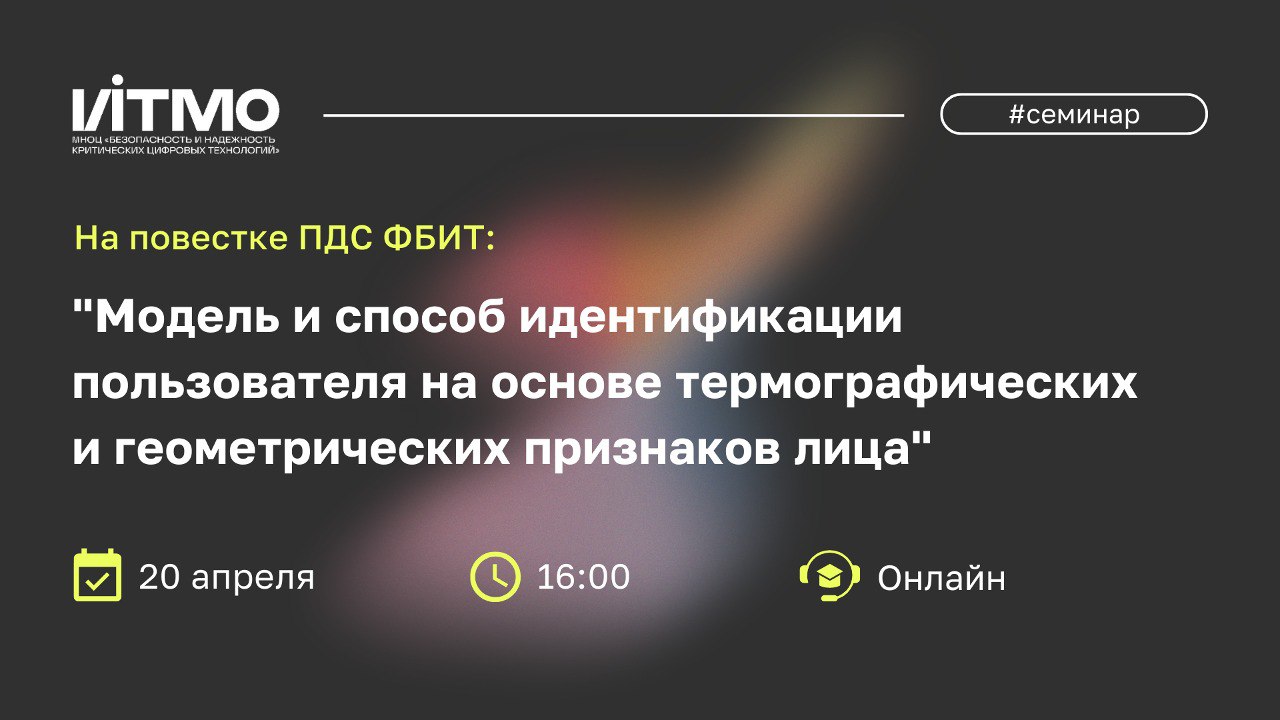 Уже сегодня на ПДС ФБИТ о совершенствовании биометрических технологий расскажет Белов Никита Игоревич в докладе “Модель и способ идентификации пользователя на основе термографических и геометрических признаков лица”.
