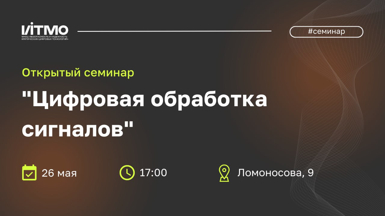 Семинар пройдет 26 мая (пятница) в 17:00 на ул. Ломоносова, 9 (ауд. 3320). Присоединяйтесь и продолжите знакомство с теорией ЦОС!