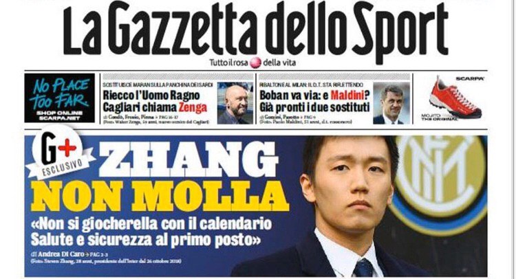 «Вы не можете возиться с календарем и рисковать людьми, которые толпятся на стадионе, ставя под угрозу безопасность и здоровье. Все это не игра или шутка: недопустимо, чтобы вы пошли даже на малейший риск, и как президент клуба, у меня есть миссия и ответственность, чтобы донести правильное сообщение. Я должен сообщить фанатам «Интера», «Ювентуса» или «Милана», что здоровье имеет первостепенное значение, мы должны быть очень осторожны. Я думаю, что кто-то не знает или не хочет думать об этом».