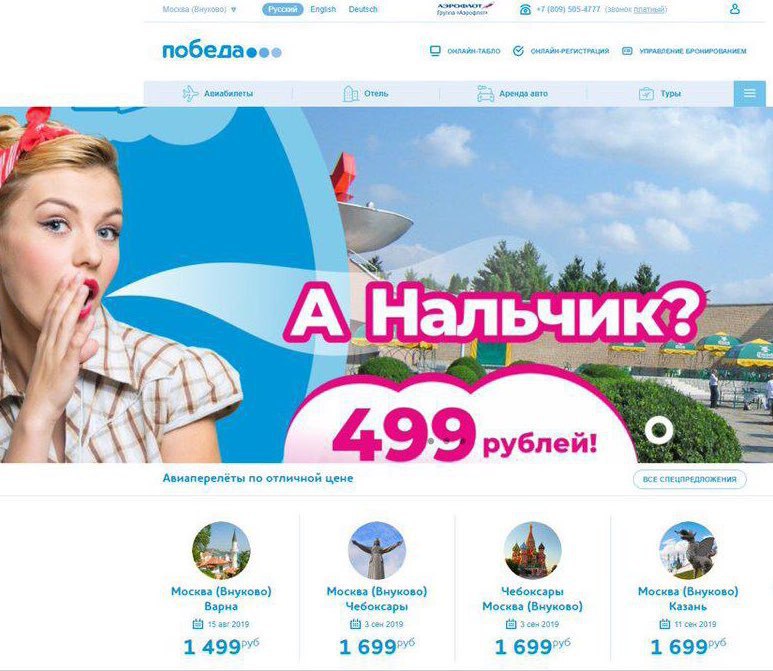 Авиакомпания «Победа» стабильно на коне. Сначала новость о распродаже билетов, потом — о том, что сайт прилёг от наплыва желающих, теперь вот новые баннеры. Три разных инфоповода для привлечения трафика на сайт: сначала люди идут посмотреть, чё почём. Потом идут проверить — правда ли сломалось. А потом идут посмотреть, правда ли дочка «Аэрофлота» у себя на сайте замутила баннер с тупой и похабной шуткой (и заодно глянуть, чё почём).